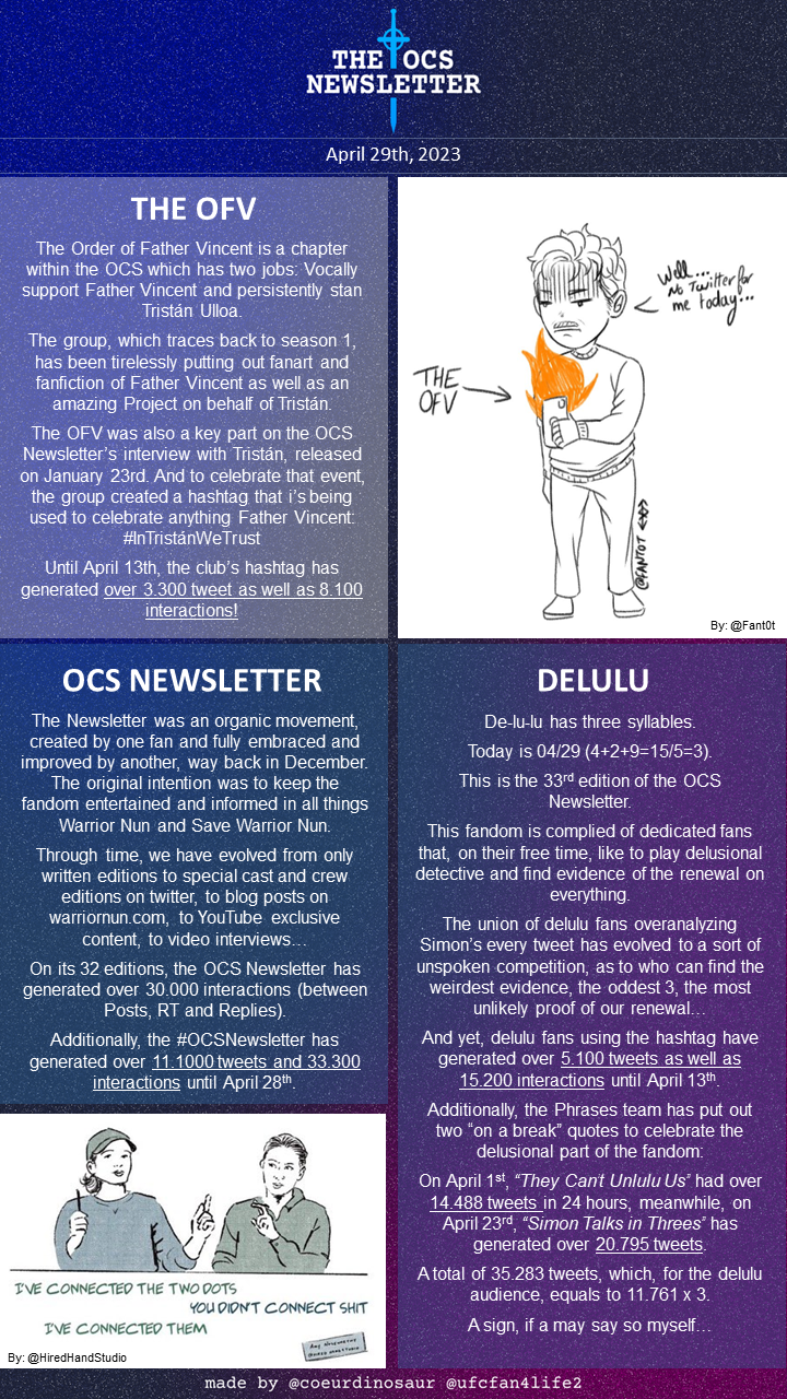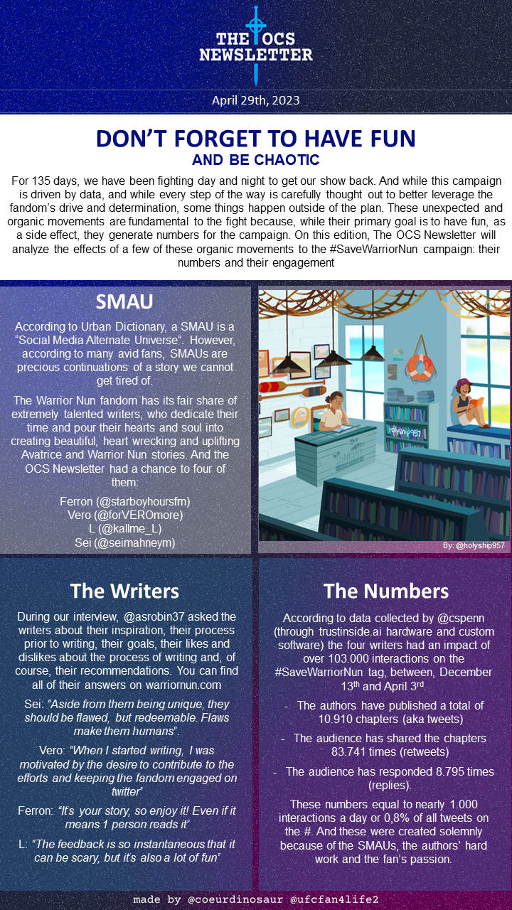 For 135 days, we have been fighting day and night to get our show back. And while this campaign is driven by data, and while every step of the way is carefully thought out to better leverage the fandom’s drive and determination, some things happen outside of the plan. These unexpected and organic movements are fundamental to the fight because, while their primary goal is to have fun, as a side effect, they generate numbers for the campaign. On this edition, The OCS Newsletter will analyze the effects of a few of these organic movements to the #SaveWarriorNun campaign: their numbers and their engagement