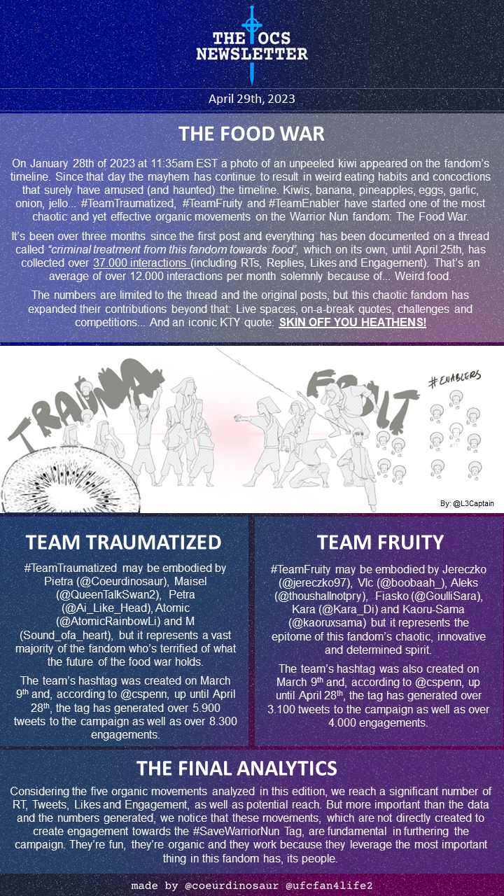 On January 28th of 2023 at 11:35am EST a photo of an unpeeled kiwi appeared on the fandom’s timeline. Since that day the mayhem has continue to result in weird eating habits and concoctions that surely have amused (and haunted) the timeline. Kiwis, banana, pineapples, eggs, garlic, onion, jello... #TeamTraumatized, #TeamFruity and #TeamEnabler have started one of the most chaotic and yet effective organic movements on the Warrior Nun fandom: The Food War.