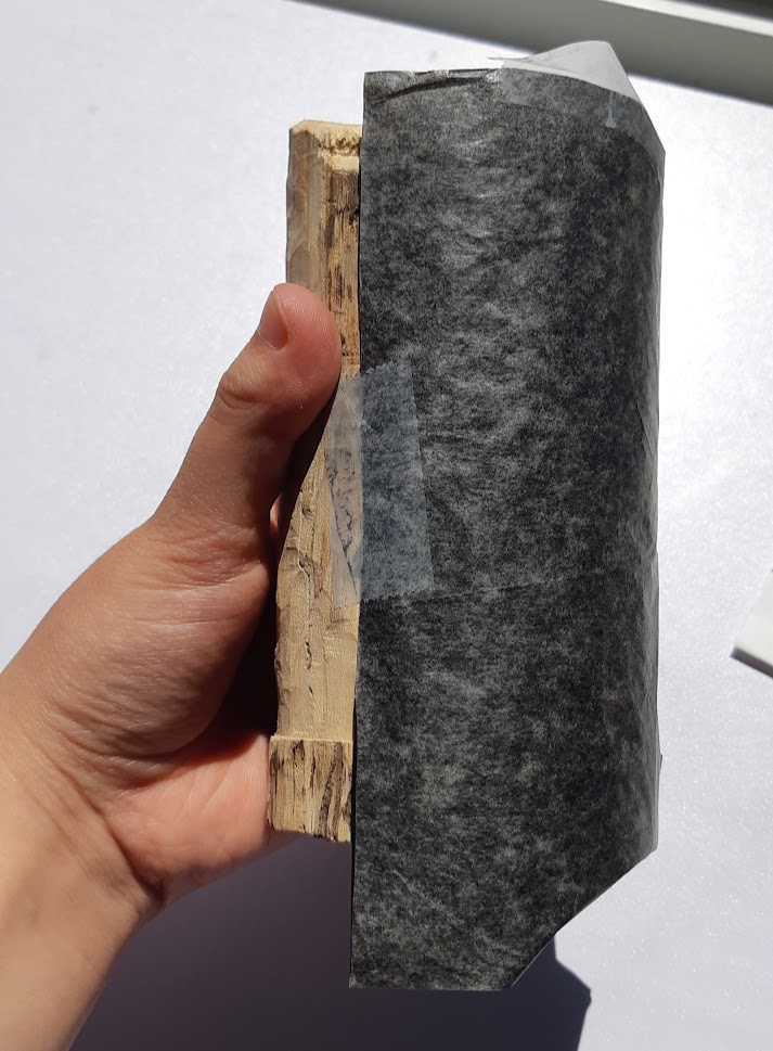 3. Graphite transfer sheets are essentially thin paper that is entirely covered by graphite on one side, so hold it gently and try not to fold or crumple it on itself. Generally, these are larger than the size of the cup or stencil, so you can cut it to the size of the stencil (I didn't include the lines going all the way around because I did not have a big sheet). Tape (painter’s tape) the transfer sheet to the vessel you chose, placing its graphite side in contact with it, approximately where you want the design to be centred. (I don't have another pot... so this demo is on a hunk of wood approximately the size of a cup) If you don't want to reuse the paper, you can probably just cut it to the size of the pottery piece you have.