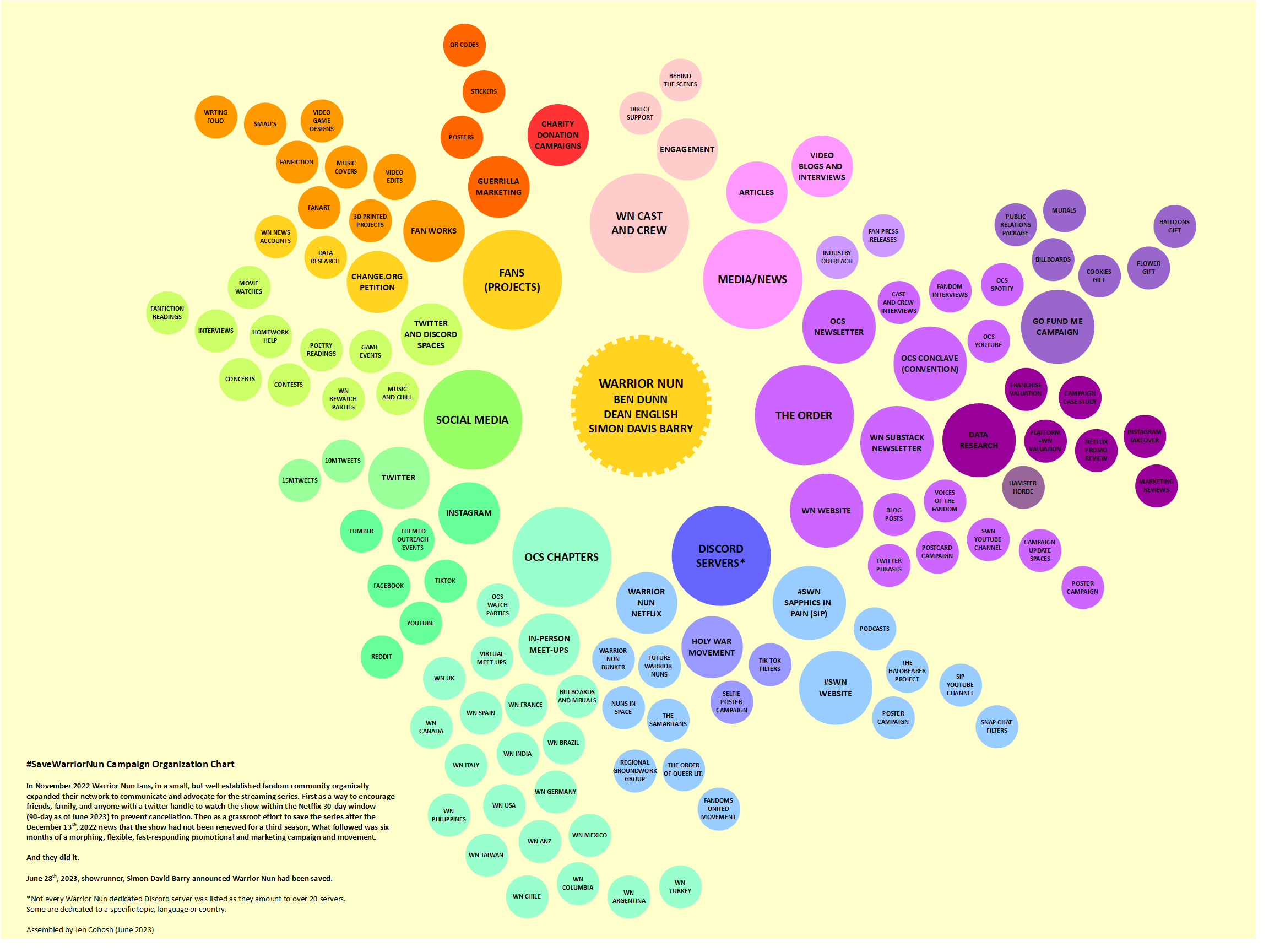 How did the Warrior Nun fans save the series? Connectivity and outreach. The fans built their own network of information, content, and data driven goals. This strengthened and expanded the existing fandom. This chart is available as a poster so anyone that wishes to may print it off as a reminder that WHAT WE ARE IS BEAUTIFUL. There is a project timeline poster to follow.