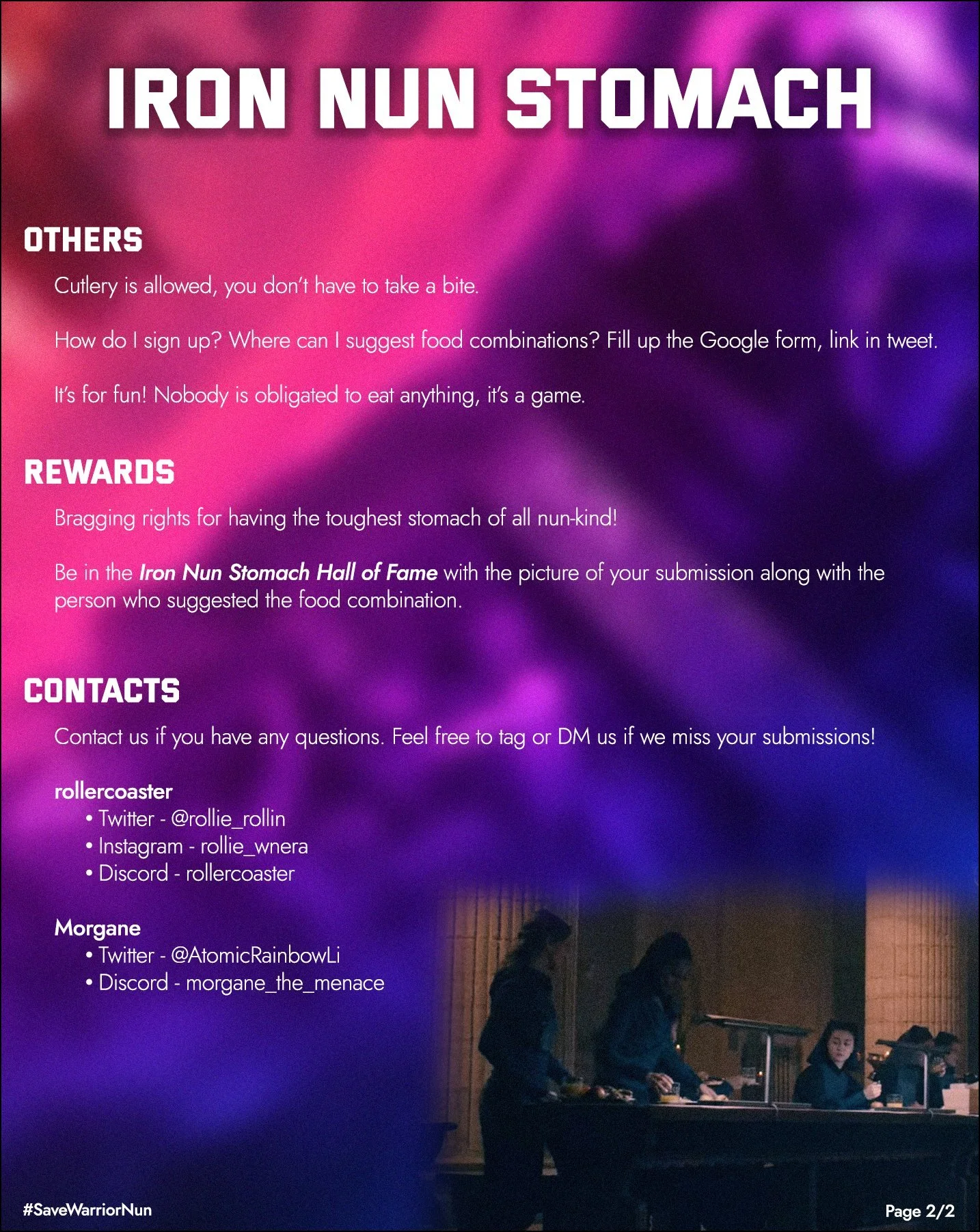 M. The Iron Nun Stomach is a challenge where warned people will have to try weird food combinations to get points and prove to everyone they have the toughest stomach.