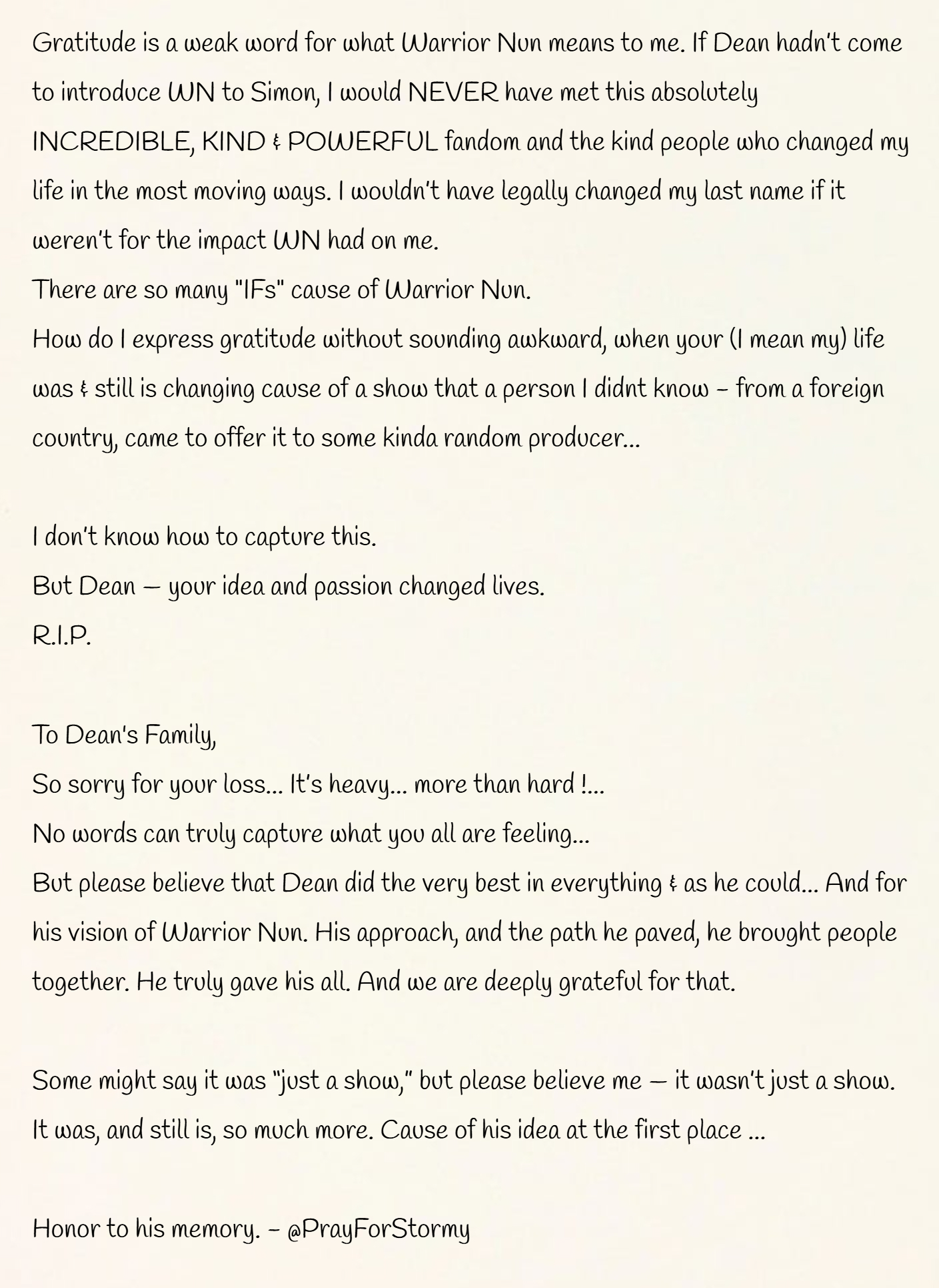 First of all I would like to offer my condolences and I hope that the love that the Warrior Nun fandom can send you will help you overcome this a little bit more.